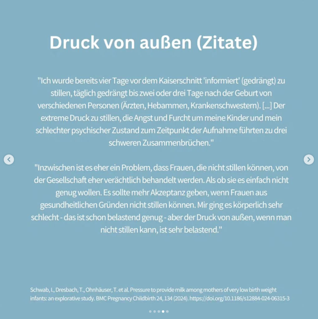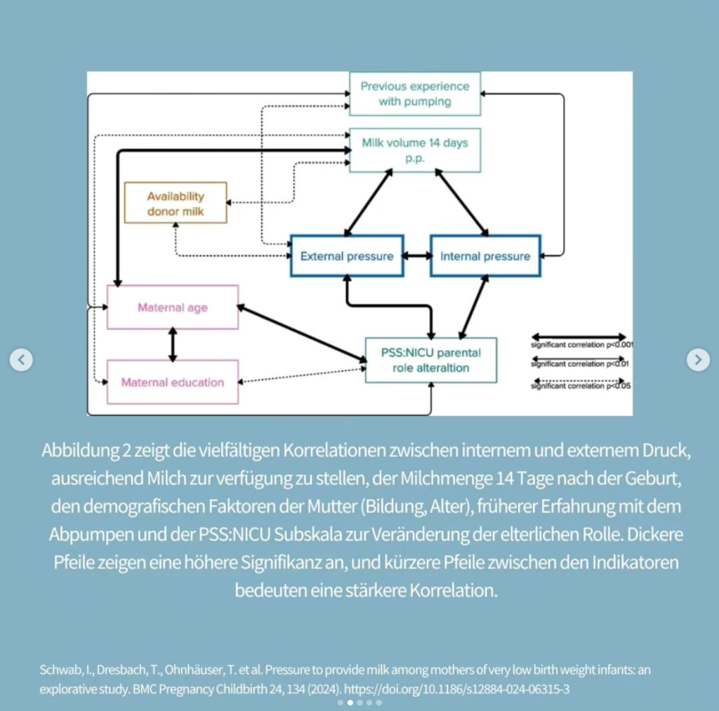 Druck von außen haben nur 34 Prozent der Mütter angegeben. Gleichzeitig hat sich gezeigt, dass die Milchmenge nach 14 Tagen hier eine große Rolle spielt, da Mütter, die am Tag 14 mehr als 500 ml Milch hatten, signifikant weniger Druck verspürt haben (sowohl selbst gemacht, wie auch von extern). Das Vorhandensein einer Spenderinnenmilchbank führte dagegen dazu, dass weniger Druck von außen geäußert wurde.